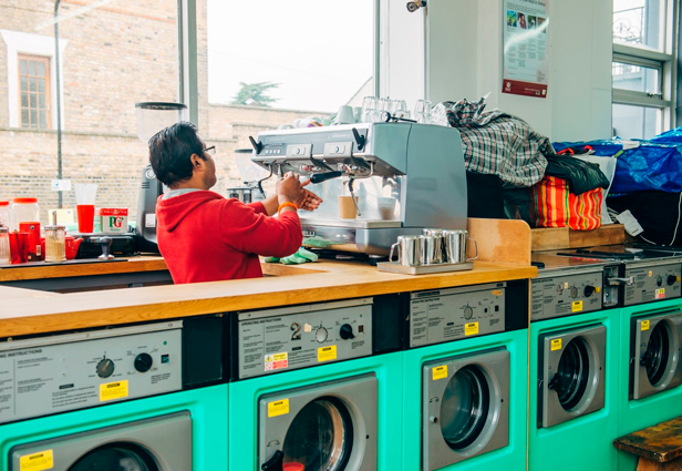 Chatsworth Launderette llama la atención no sólo por su concepto híbrido, sino por su diseño vintage. Y es que, cuando entras, lo primero que ves es la barra de café construida con paneles de lavadoras retro color verde menta. Dentro de ellas no hay ropa, sino refrescos y otras bebidas embotelladas.