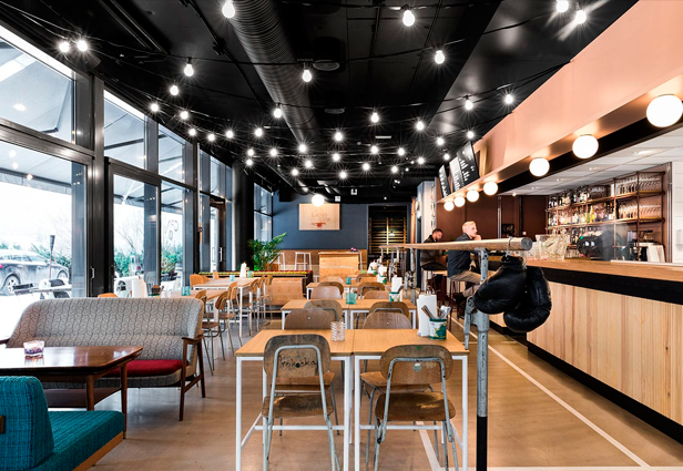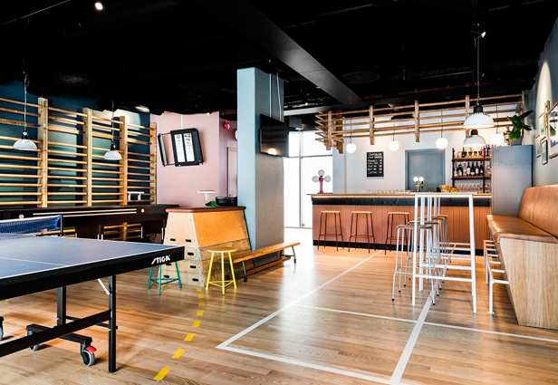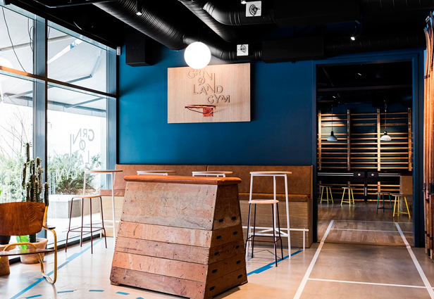 El lugar, diseñado por Radius Design, un estudio de identidad e interiorismo, cuenta con equipamiento deportivo como parte del mobiliario y con detalles decorativos como aros de baloncesto, barras de pared y fotografías en blanco y negro relacionadas al mundo de los deportes.